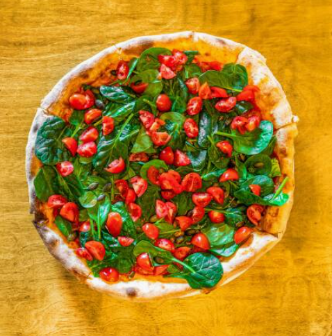 sos pomidorowy, mozzarella, świeży szpinak, pomidory koktajlowe, prażone pestki dyni, oliwa z oliwek extra vergine + na życzenie: salami, szynka, boczek, kiełbasa