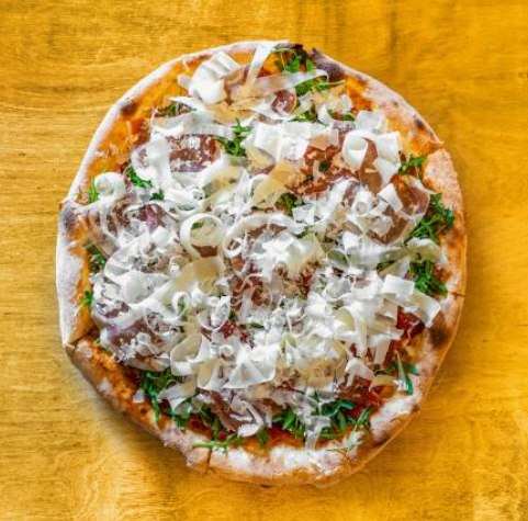 sos pomidorowy, mozzarella, szynka dojrzewająca, płatki parmezanu, świeża rukola, bazylia